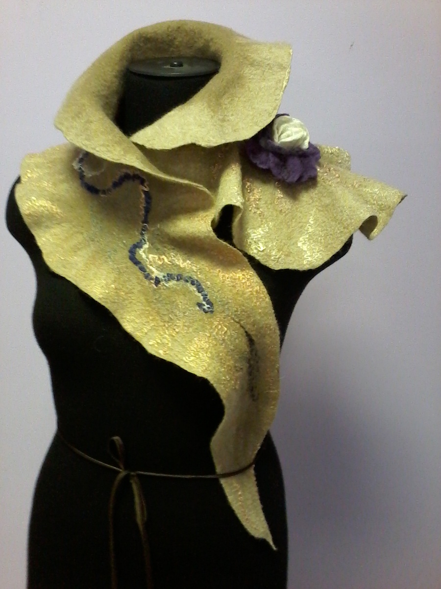 🌟 Эксклюзивный валяный шарф с цветочным декором: стиль и уют в каждой детали 🌟 Представляем вам уникальное изделие ручной работы — изысканный валяный шарф, который станет изюминкой вашего гардероба! 🧣 ✨ Особенности этого шедевра: Материал: мягкий войлок, который дарит тепло и комфорт в прохладную погоду. Дизайн: асимметричные воланы создают эффектный и элегантный силуэт. Цвет: нежный бежевый оттенок с лёгким золотистым блеском — универсальный вариант для любого образа. Декор: объёмный цветок из войлока в фиолетово-белых тонах добавляет шарм и индивидуальность. Такой акцент делает шарф не просто аксессуаром, а настоящим арт-объектом! Форма: свободно облегает шею, легко драпируется и не стесняет движений. 🎨 Почему этот шарф стоит выделить? Ручная работа: каждая деталь выполнена с любовью и вниманием к мелочам. Эксклюзивность: благодаря особенностям валяния, двух абсолютно одинаковых изделий не бывает. Практичность: войлок не только тёплый, но и гипоаллергенный, отлично сохраняет форм