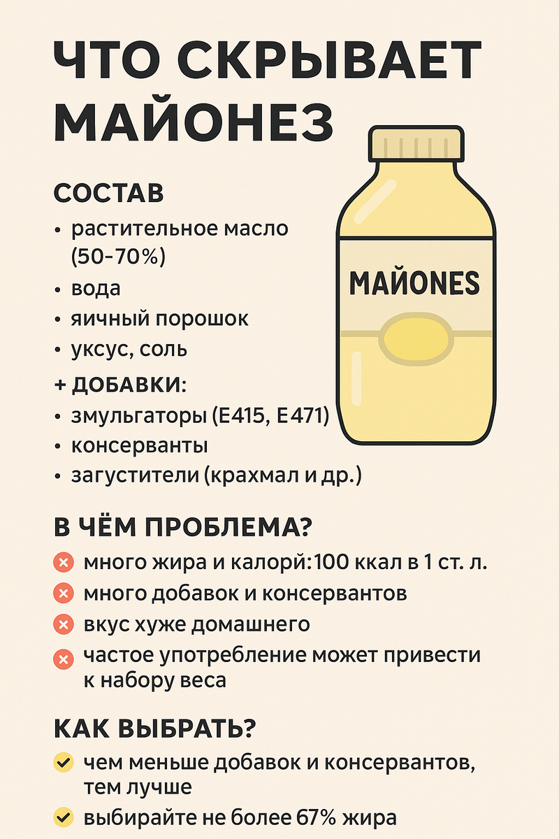 Так давайте разберёмся — что на самом деле внутри банки майонеза и стоит ли его бояться. Классический майонез — это эмульсия масла, желтков, уксуса и горчицы.