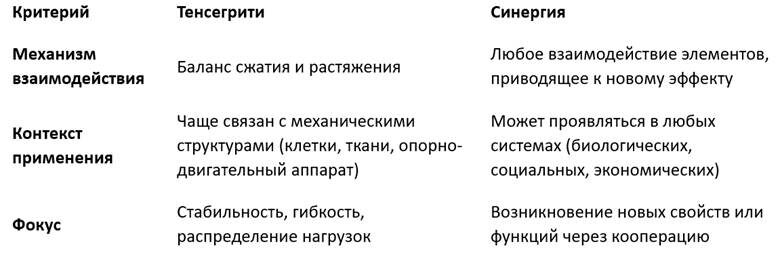 Тенсегрити в живых организмах — это специфический механизм реализации синергии, где взаимодействие элементов сжатия и растяжения создаёт устойчивую и адаптивную структуру. Таким образом, тенсегрити можно рассматривать как один из способов достижения синергетического эффекта в биологических системах, но не как универсальное понятие синергии, которое применимо в более широком контексте.