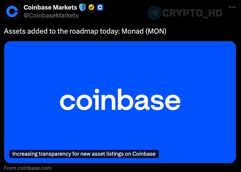 ⬆️ #MON Биржа Coinbase собирается залистить токен Monad – дорожная карта Crypto Headlines