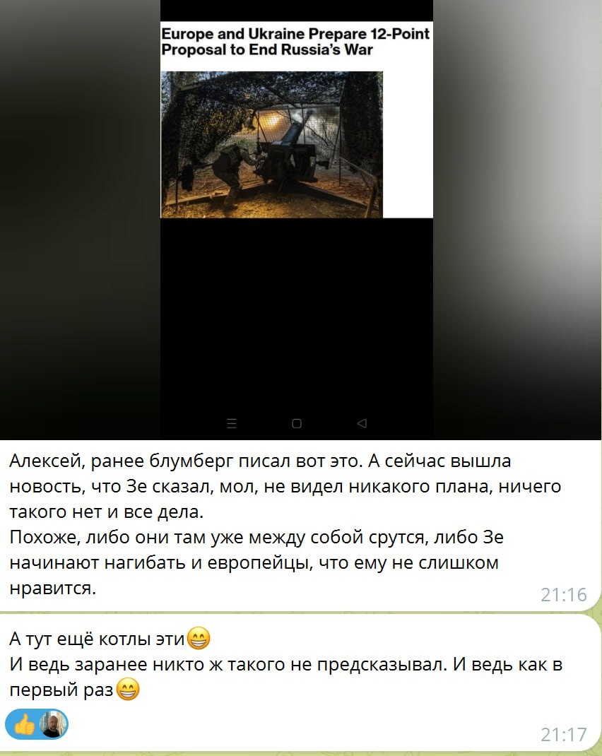 ⬆️ На скрине мнение одного из подписчиков. А это из новостей: "В пятницу британский журнал Economist сообщил, что у Украины в феврале 2026 года могут закончиться деньги на войну, поскольку два из трех источников — США и кредиты — иссякают, а страны Европы не могут договориться между собой." ☝️Трамп сегодня сделал кучу хороших заявлений, думаю вы читали их уже. Сам пока занят. ☝️Но о том что Трамп ударить по Зе в первую очередь через финансирование и через то, что у Украины закончатся бабки в итоге мы с вами говорили ещё год назад.... Когда предсказывалось что переговоры осенью настоящие начнутся и т.д. ☝️В том числе когда бабки начнут заканчиваться, ведь на 2025 год бабки были выделены ещё при Байдене. А вот на следующий Трамп показывает фигу. Не думаю что в европе всё так однозначно. Но там постепенно судя по СМИ тоже начинают прозревать... Стубб предложил Трампу и Путину встретиться на g20 в конце ноября. ☝️‼️Всё не быстро, но происходит в точности с нашей аналитикой. И по фи