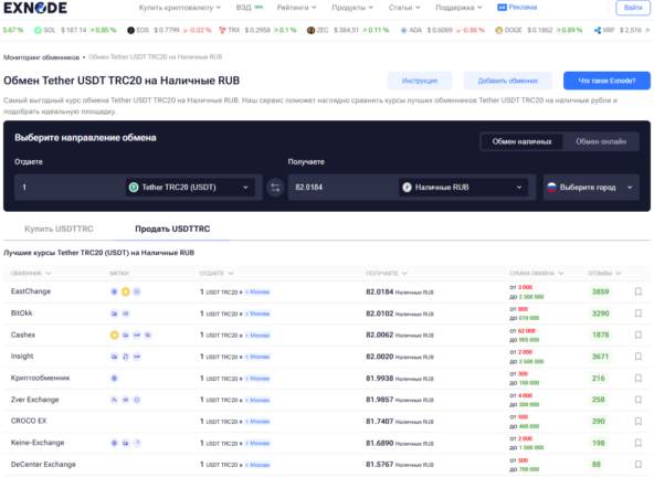 - Найдите надёжный обменник с помощью сервиса мониторинга. Зайдите на сайт Exnode, сравните предложения обменников по комиссии, условиям и репутации. Выбирайте только те площадки, где есть офисная выдача наличных. Он покажет актуальные курсы и поможет избежать случайного выбора сомнительных сервисов.