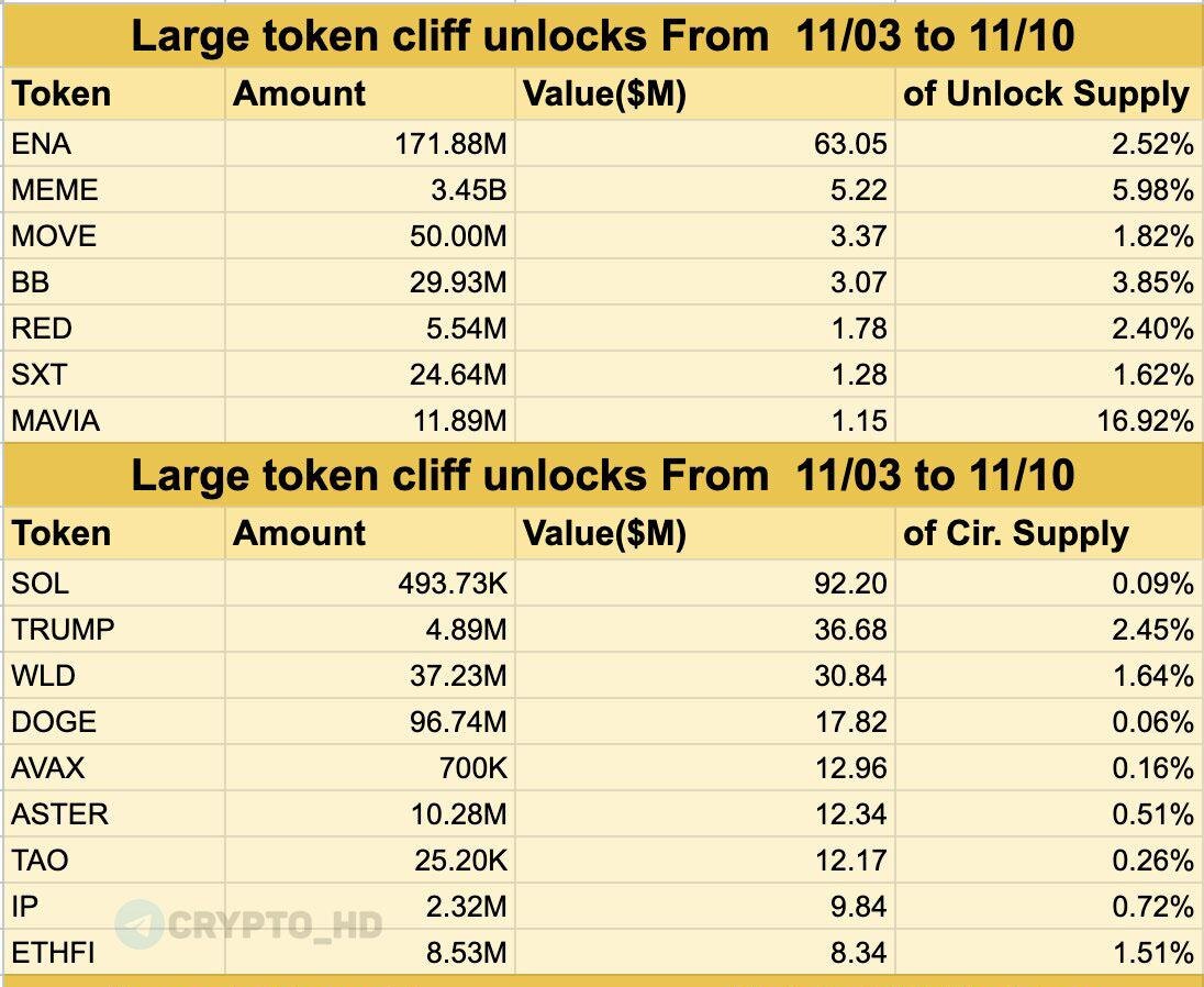 #анлок 🔓 ТОП разблокировок токенов с 3 по 10 ноября! Cliff Unlocks: ▫️#ENA – $63,05m ▫️#MEME – $5,22m ▫️#MOVE – $3,37m ▫️#BB – $3,07m ▫️#RED – $1,78m ▫️#SXT – $1,28m ▫️#MAVIA – $1,15m Linear Unlocks: ▫️#SOL – $92,20m ▫️#TRUMP – $36,68m ▫️#WLD – $30,84m ▫️#DOGE – $17,82m ▫️#AVAX – $12,96m ▫️#ASTER – $12,34m ▫️#TAO – $12,17m ▫️#IP – $9,84m ▫️#ETHFI – $8,34m P.S. Cliff Unlocks – разблокировка крупной порции токенов единовременно в конкретную дату. Linear Unlocks – постепенная разблокировка токенов в течение определенного периода (обычно каждый день или каждую неделю по части). Crypto Headlines