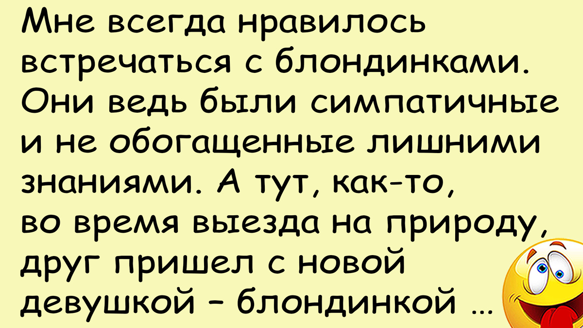 Я уже неоднократно говорил, что мне нравятся блондинки. И так получалось, что все девушки, с которыми мне повезло встречаться были светловолосыми. Причем, такими они были не только на голове, но и в душе. Она у них была чистая и светлая. А если блондинка обладает ещё и чувством юмора, то это вообще находка. Я, например, не понимаю мужчин, которые ищут себе в спутницы исключительно умных дамочек. Может они и умные, но с ними же скучно. Ну вот, что интереснее – выслушать доказательство теоремы Пифагора или то, что свет, когда его выключаешь, прячется в холодильнике? И да, самое главное, что настоящая блондинка будет оставаться блондинкой всегда, независимо от цвета волос. Так вот, возвращаясь к истории. Мы с друзьями периодически собирались на природе, чтобы отметить тот или иной праздник. Ну или просто, наступление выходных. Компания у нас была достаточно большая и веселая. Собирались мы вместе с женами и подругами. Так удобнее – кто-то шашлыки жарит, кто-то салатики готовит, ну а кто-т