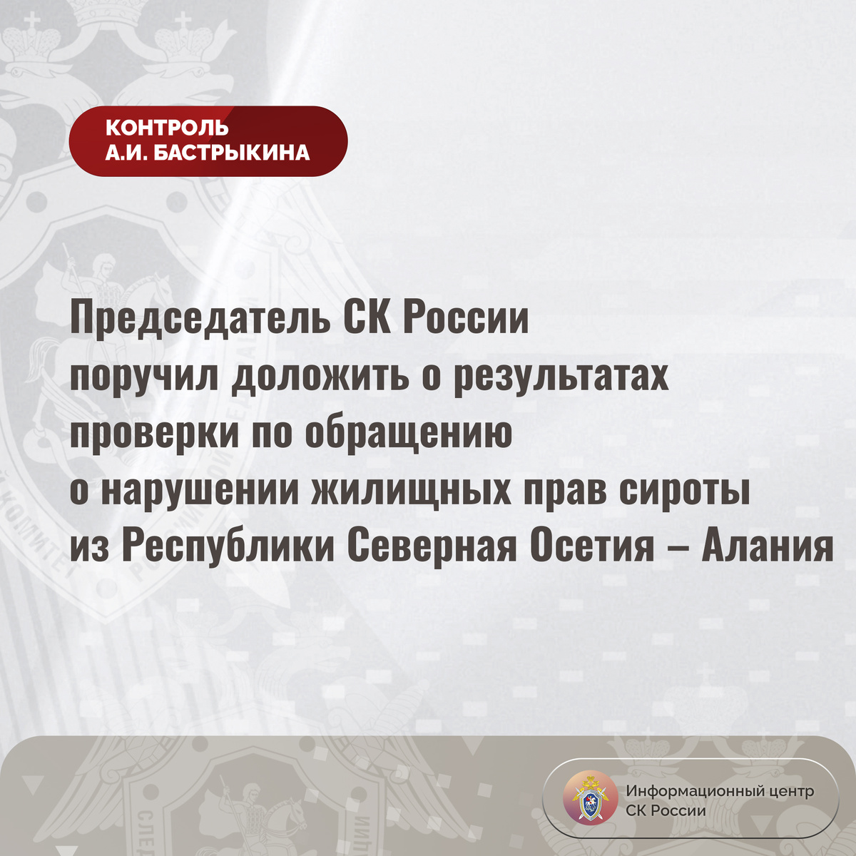 Председатель СК России поручил доложить о результатах проверки по обращению о нарушении жилищных прав сироты из Республики Северная Осетия
