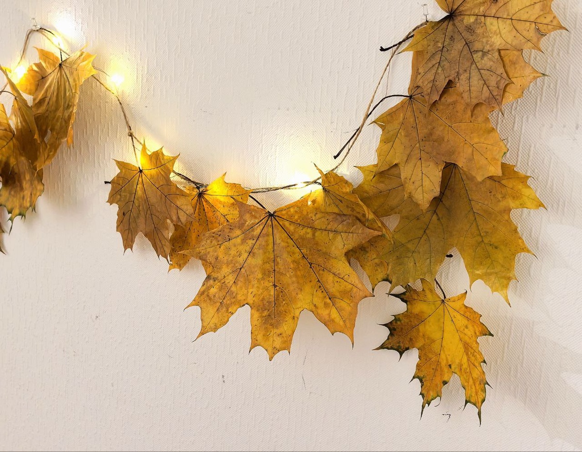 Когда я зажгла огоньки, комната преобразилась: тёплые тени от листьев заплясали на стенах, а сквозь прожилки клёна стал проступать мягкий золотистый свет.