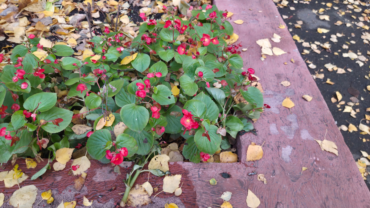 Странности теплого ноября. Вот как так? Ладно, я согласна на астры однолетние, их я даже сфоткать вблизи не удосужилась. Цветут и цветут, тут точно ничего странного. Бархатцы кое-где остались. Значит, пока не так уж и холодно? Про розы вообще молчу. Хотя розы явно заканчивают эпопею, засыпают, уже и фотографировать остатки былой роскоши не хочется. Но бегонию сфоткала, не удержалась. Видимо, холод до неё не дотянулся, во всей красе пока. Мне кажется, даже ярче стала? И это вроде не всегдацветущая, каких летом было много? Листочки не такие. Бегония явно не понимает, что уже почти минус, вот-вот. Идём чуть дальше. Там вообще вроде и не осень? Или какая-то неправильная осень? Мальва явно сезоны попутала. Красавица гонит соцветие на фоне листопада, притом не в самом его начале (см. на землю): На фото ниже ничего особенного, та же мальва. Но видно, что на земле листьев больше, чем на древесных растениях. Но в обычные годы в это время листвы на деревьях вообще нет, ну или раз-два-три, и в