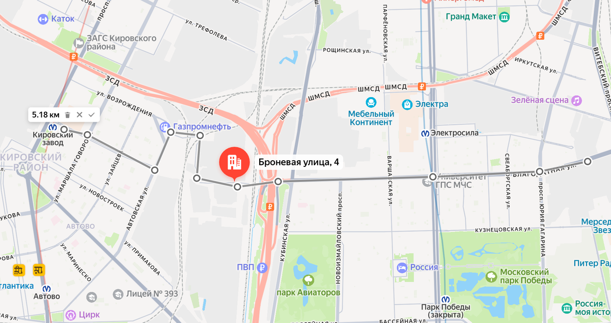 Удобный пешеходный и самокатный маршрут между метро «Электросила» и «Кировский завод»