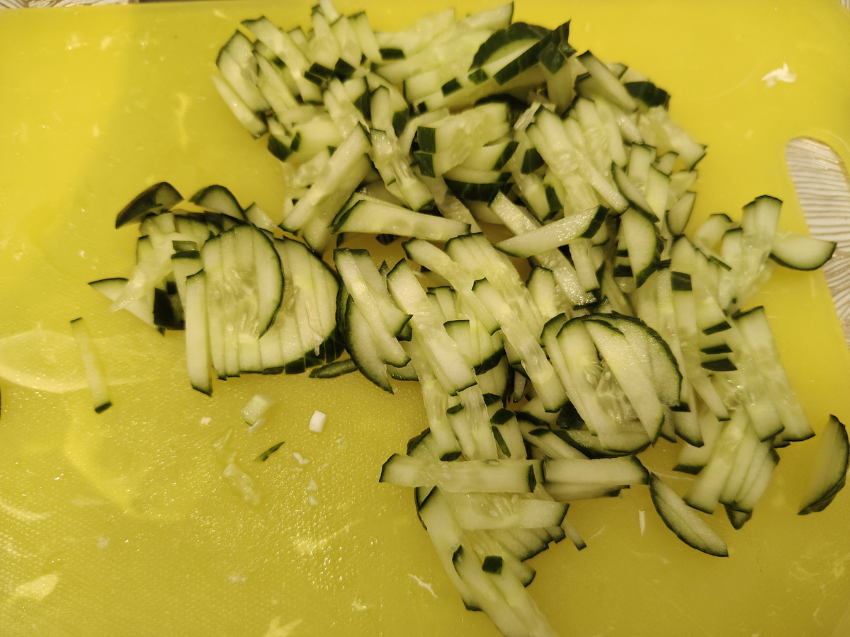 Захотелось майонезного салатика? Покопавшись в своём холодильнике, я нашла эти продукты, этого вполне хватит для приготовления вкусного салата, который легко и быстро можно приготовить. На потребуются : Отварные яйца Свежий огурец Кусочек сыра Консервированная кукуруза Зелень укропа Майонез(можно разбавить сметаной) Чеснок Соль, перец по вкусу. Высыпаем кукурузу в миску, предварительно слив рассол. Нарезаем яйца, у меня яйцерезка. Можно измельчить ножом или натереть на крупной тёрке. Огурец нарезаем соломкой. Добавляем в салатник с кукурузой и яйцами. Сыр натереть на крупной тёрке. Чеснок натереть на мелкой тёрке или пропустить через пресс. Далее измельчить укроп. Всё добавить к остальным ингридиентам в салатник. Соль и перец добавляем по вкусу. Заправить майонезом. Перемешиваем. Вот и все, очень быстро готовиться и очень вкусно! Попробуйте приготовить. Приятного аппетита! 👍🥰