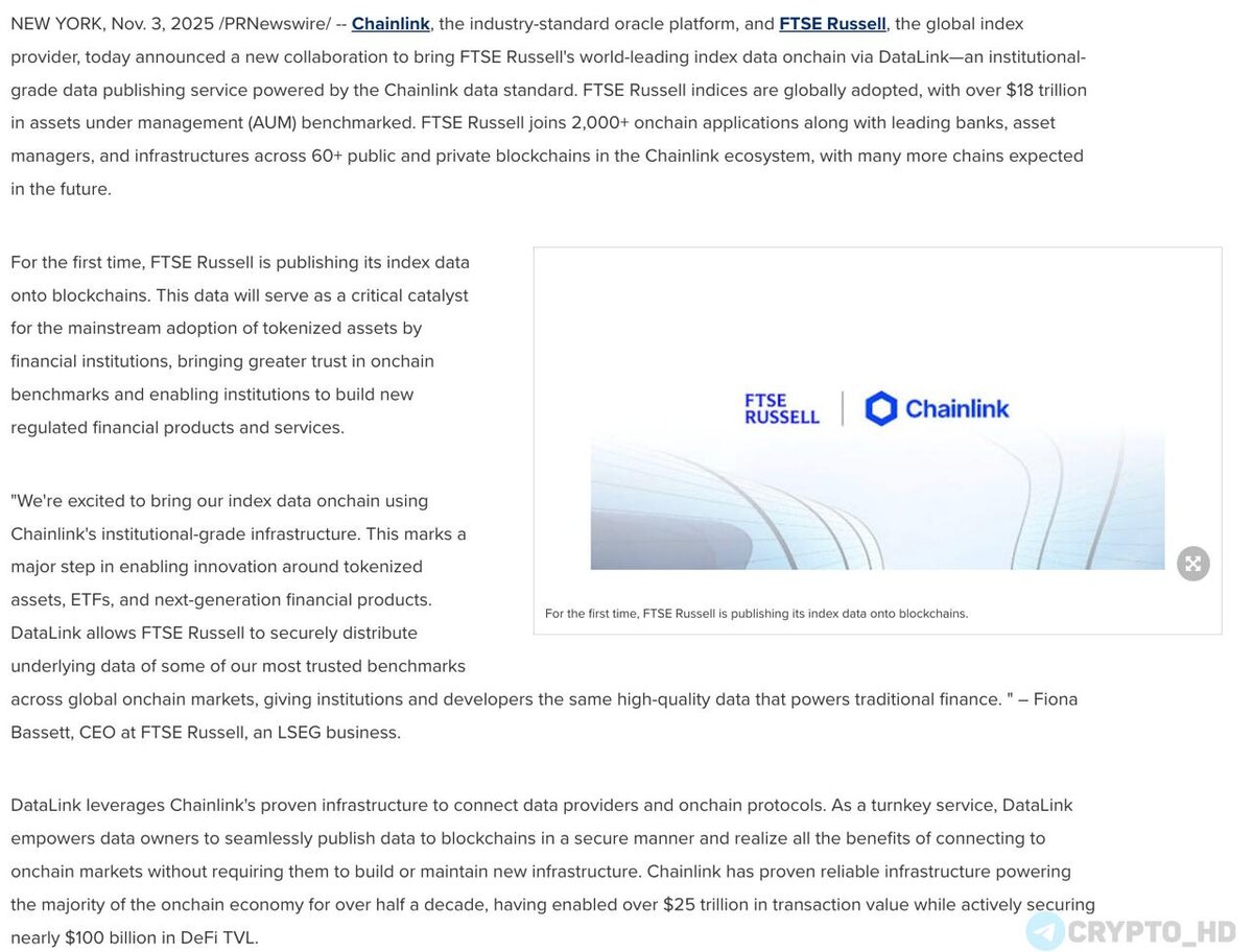 🔥 #LINK Данные мировых индексов на блокчейне Chainlink – анонс FTSE Russell и Chainlink объявили о партнерстве. Данные индексов Russell 1000, Russell 2000, Russell 3000 и FTSE 100, а также валютные и цифровые показатели станут доступны на блокчейне Chainlink. FTSE Russell – один из крупнейших поставщиков рыночных индексов, используемых для управления активами на сумму более $18,000,000,000,000 по всему миру. Ранее: - ЦБ Бразилии и Гонконга - Deutsche Bank и DWS - S&P Global - банк UBS - SWIFT - Министерство торговли США Crypto Headlines