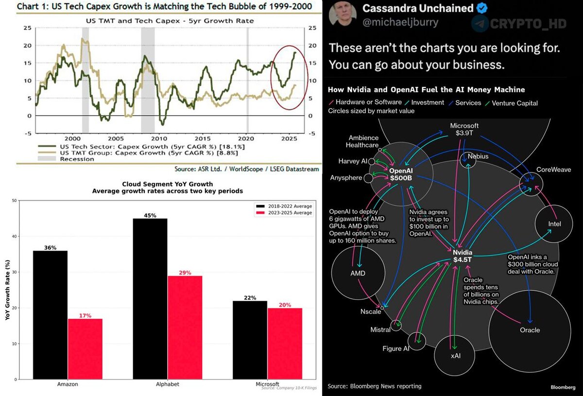 🔞 Майкл Бэрри снова намекает на пузырь в AI-секторе… «Это не те графики, которые вы ищете. Можете заниматься своими делами». Легендарный инвестор завуалированно предупреждает о возможном пузыре в сфере искусственного интеллекта (#AI) – похожем на дотком-бум конца 90-х. ➥ Nvidia и OpenAI создают гигантскую сеть взаимных инвестиций – корпорации вливают сотни миллиардов в одни и те же проекты. Это классическая схема перегрева. ➥ ASR Ltd фиксирует, что рост капитальных расходов (CapEx) в технологическом секторе уже достиг уровней 1999-2000 гг. – как перед крахом доткомов. ➥ Данные по облачным сервисам демонстрируют резкое замедление выручки Amazon, Google и Microsoft – рост снижается вдвое, несмотря на рекордные инвестиции в AI. ➥ Проще говоря, деньги в сектор текут рекой, а реальная отдача пока не поспевает. Именно так начинались пузыри прошлого. Напомним, по истории успеха Майкла Бэрри сняли фильм «Игра на понижение» (Big Short). Ранее: Майкл Бэрри вернулся Crypto Headlines