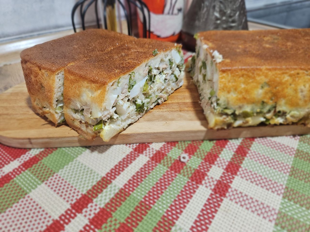 🍎 Завтрак: Заливной пирог с тунцом, кофе/чай с молоком , 20 гр. шоколада Готовим на 3 порции. Калорийность порции 340 ккал Состав: Начинка : Баночка тунца в собственном соку, яйцо - 4 шт., зеленый лук - большой пучок, соль, перец - по вкусу Тесто: Мука цельнозерновая рисовая или пшеничная - 90 гр., кефир 1% - 100 мл, яйцо - 2 шт., разрыхлитель - 1 ч.л., соль, перец - по вкусу Приготовление: Отварите вкрутую 4 яйца и нарежьте достаточно крупно. Измельчите большой пучок зеленого лука. Слейте жидкость из баночки тунца в собственном соку, рыбу раздавите вилкой. Соедините все ингредиенты начинки пирога и тщательно перемешайте. Соедините муку, 2 яйца, кефир и разрыхлитель. Посолите тесто и тщательно перемешайте. Влейте 1\2 часть теста в силиконовую форму. Выложите начинку. Сверху равномерно распределите оставшееся тесто. Поставьте в хорошо разогретую духову и выпекайте при t180C 30-40 минут, точное время зависит от вашей духовки. Дайте пирогу остыть, потом извлеките из формы. 🍎 Перекус: