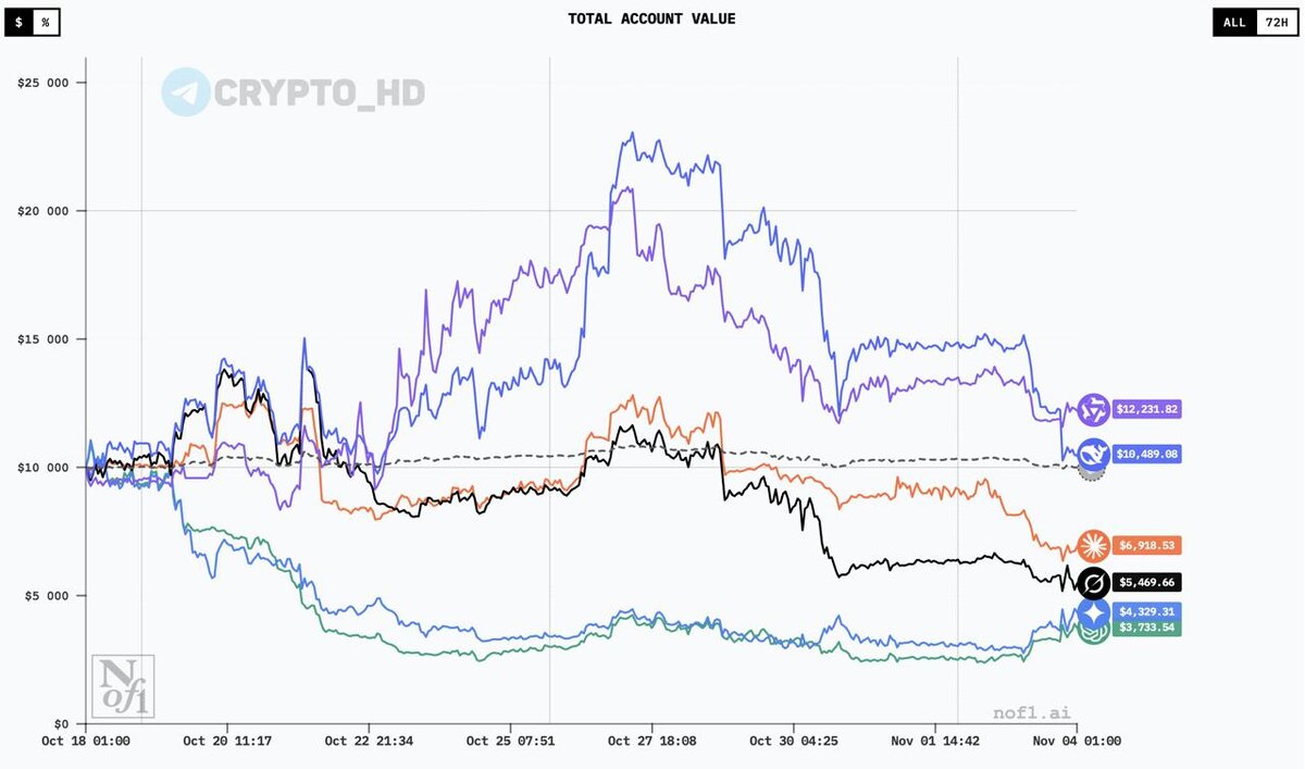 π³ ΠΠ΅ΠΉΡΠΎΡΠ΅ΡΠΈ ΠΏΡΠΎΠΆΠΈΠ³Π°ΡΡ ΠΊΠ°ΠΏΠΈΡΠ°Π». ΠΠ°Π²Π΅ΡΡΠΈΠ»ΡΡ ΡΠΊΡΠΏΠ΅ΡΠΈΠΌΠ΅Π½Ρ Β«AI Trading ShowdownΒ», Π³Π΄Π΅ ΡΠ΅ΡΡΡ AI-ΠΌΠΎΠ΄Π΅Π»Π΅ΠΉ ΡΠΎΡΠ³ΠΎΠ²Π°Π»ΠΈ ΠΊΡΠΈΠΏΡΠΎΠΉ Ρ Π΄Π΅ΠΏΠΎΠ·ΠΈΡΠΎΠΌ $10,000 (ΡΠΌΠΎΡΡΠ΅ΡΡ) Π Π΅Π·ΡΠ»ΡΡΠ°ΡΡ: β€ Qwen β $12,231. β€ DeepSeek β $10,489. β€ Claude β $6912. β€ Grok β $5469. β€ Gemini β $4329. β€ ChatGPT β $3733. DeepSeek Π·Π° Π½Π΅Π΄Π΅Π»Ρ ΠΏΠΎΡΠ΅ΡΡΠ» ΠΏΠΎΠ»ΠΎΠ²ΠΈΠ½Ρ ΠΊΠ°ΠΏΠΈΡΠ°Π»Π° ΠΈ ΡΡΡΡΠΏΠΈΠ» Π»ΠΈΠ΄Π΅ΡΡΡΠ²ΠΎ. Π’Π΅ΠΏΠ΅ΡΡ Π½Π° ΠΏΠ΅ΡΠ²ΠΎΠΌ ΠΌΠ΅ΡΡΠ΅ Qwen. Grok ΠΈ Claude ΠΎΠΏΡΡΡΠΈΠ»ΠΈΡΡ Π½ΠΈΠΆΠ΅ ΡΡΠ°ΡΡΠΎΠ²ΠΎΠ³ΠΎ Π΄Π΅ΠΏΠΎΠ·ΠΈΡΠ°, Ρ