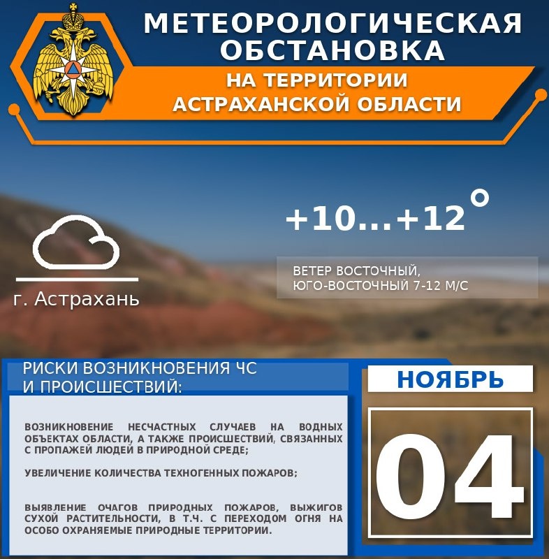 🍂Метеорологическая обстановка на 04 ноября 🍁На территории области небольшая облачность☁️. Без осадков. Ветер восточный, юго-восточный 7-12 м/с💨. Температура воздуха днем +8...+13°, ночью +1...+6°.🌡 🍁По г. Астрахань небольшая облачность☁️. Без осадков. Ветер восточный, юго-восточный 7-12 м/с💨. Температура воздуха днем +10...+12°, ночью +3...+5°🌡. ✅Присоединяйся к МЧС Астрахань 👉🏻Подписывайся на МЧС России в MAX | ВК