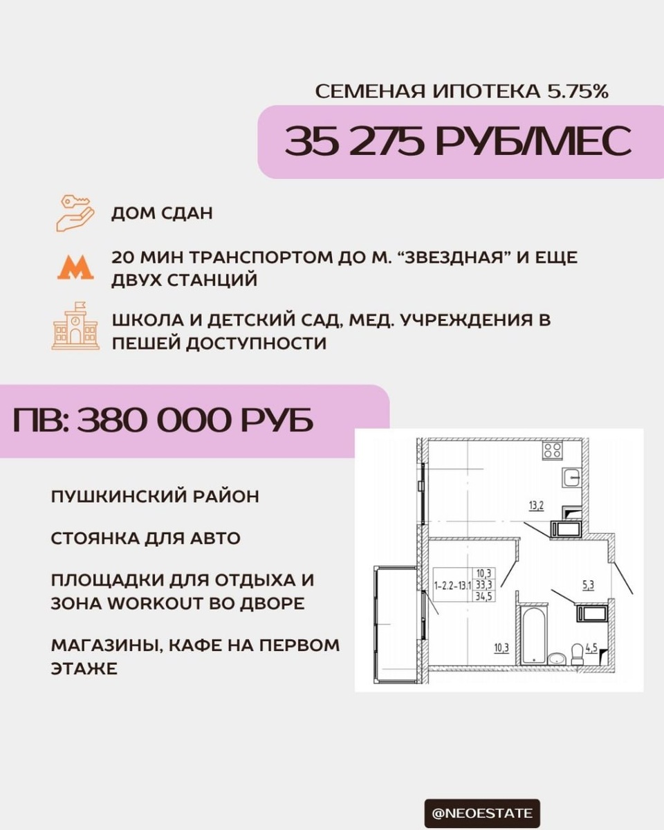 Первоначальный взнос — 380 000 ₽ Дом готов — ключи можно получить сразу. 🏡 О проекте 12-этажный монолит в Пушкинском районе: — квартиры с отделкой или без, — потолки 2,72 м, — планировки с кухнями-гостиными, — двор с площадками, видеонаблюдением и подземным паркингом. До метро «Купчино» — 15–20 минут транспортом. 💰 По семейной ипотеке: — ставка — 5,75%, — первоначальный взнос —380 000 ₽, ⚠️ Почему важно сейчас: Минтруд уже согласовал обновления по семейной ипотеке. К 2026 году ставка для семей с одним ребёнком может вырасти, а действующие условия сохранятся только для тех, кто оформит кредит заранее . 👉 Напишите в @NeoEstate_bot — вышлем планировки и рассчитаем платёж по вашему кейсу. #объекты_Спб
