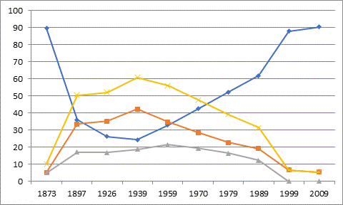 Синий цвет азербайджанцы, красный – русские, зеленый –армяне, фиолетовый суммарное количество христианского населения.