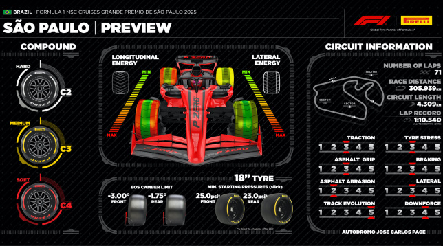Шинники Pirelli подготовили для Гран При Сан-Паулу более жёсткие составы резины, чем те, которые использовались в прошлом году. В этом сезоне резины C2, C3 и C4 будут применяться в качестве Hard, Medium и Soft соответственно. Это изменение связано с тем, что в 2023 году на тренировках в пятницу и субботу наблюдался высокий уровень износа и деградации шин, особенно на ведущих колёсах. Обновлённое асфальтовое покрытие трассы оказалось достаточно гладким и менее абразивным, что также повлияло на поведение шин. Обновлённый асфальт и естественное старение покрытия могут привести к тому, что более жёсткие составы резины станут более устойчивыми к износу. В 2025 году составы резины в целом менее подвержены деградации по сравнению с шинами прошлого года. Это может позволить командам более активно использовать мягкие шины, которые в предыдущем сезоне пригодились только для квалификации к спринту. Трасса в Интерлагосе имеет интересную конфигурацию, где движение организовано против часовой стрелк