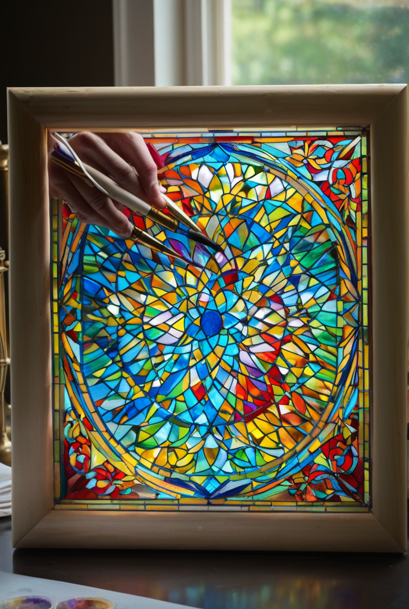 - Панно: Вставьте расписанное стекло в раму‚ и готово эксклюзивное панно‚ которое ловит солнечные лучи и наполняет комнату цветными бликами.