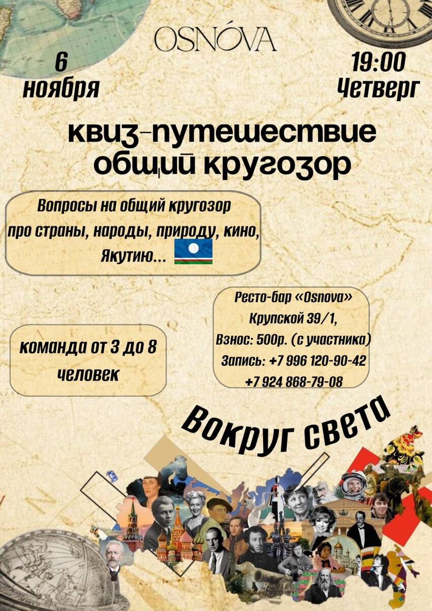Квиз-путешествие «Вокруг света» #Вечером Вопросы на общий кругозор про страны, народы, природу, кино, Якутию... Играют команды от 3 до 8 человек 6 ноября | 18:00 Osnova, Крупской 39/1 500 руб. +7 996 120-90-42, +7 924 868-79-08 Online Якутия | Ждем вас в МАХ