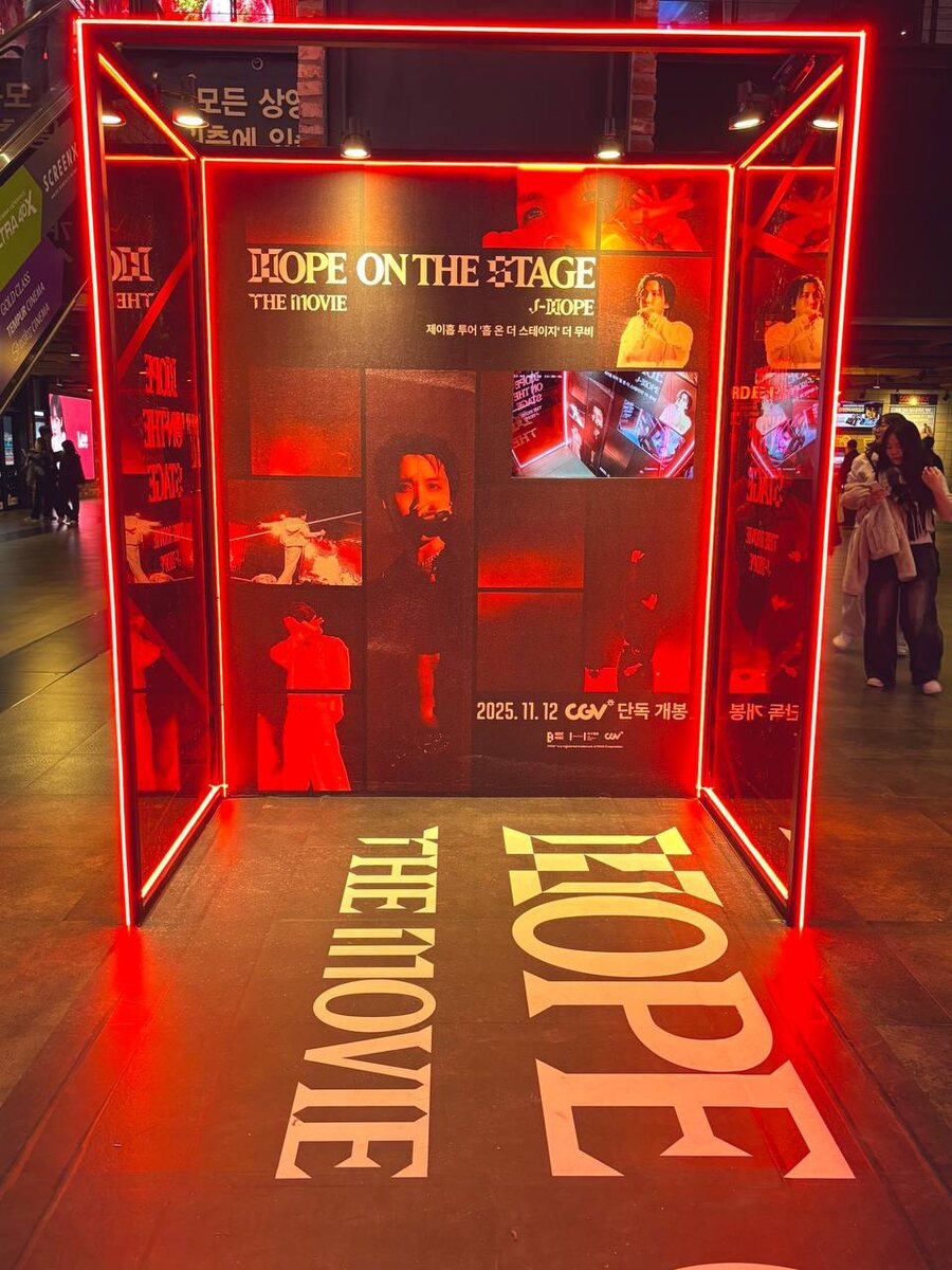 3 ноября стартовал показ фильма HOPE ON THE STAGE TOUR The Movie IMAX. В кинотеатре CGV Yongsan IPark Mall сделали суперские фотозоны для Арми. Страсть мирового турне, увековеченная в легенде на большом экране: J-Hope из BTS, момент, когда он покорил экран, музыку и лидерство. Под конец осени все вновь расцвело под именем J-Hope из BTS. Его путь, включающий сценическое присутствие, выступления на экране, лидерство и художественное совершенство, разворачивается как культурное возрождение. Концерт HOPE ON THE STAGE FINAL Goyang Encore, который прошел в июне на главном стадионе города Коян, взбудоражил более 524 000 фанатов. Фильм HOPE ON THE STAGE TOUR The Movie, запечатлевший живое выступление, неизданные сцены и закулисные истории, открывает новую главу перед его глобальным релизом по всему миру — 12 ноября. J-Hope из BTS успешно завершил свое мировое турне, выступив с 33 концертами в 16 городах от Сеула до Северной Америки, Азии и Европы. Его историческое выступление на стадионе BM
