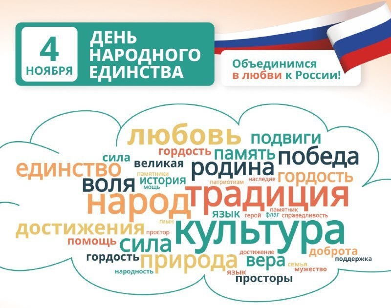 🇷🇺 День народного единства: объединяемся в любви к России! 4 ноября мы отмечаем День народного единства. В этот день мы вспоминаем важные события в истории нашей страны и выражаем гордость за её достижения. ❤️ Желаем каждому из вас гордиться российской историей, традициями и культурой. Пусть этот день будет наполнен радостью, счастьем и благополучием! ☁️ Мы создали волшебное облако слов, наполненное любовью и гордостью за Россию. А какие слова вы бы добавили в это облако? Пишите в комментариях! #ДеньНародногоЕдинства