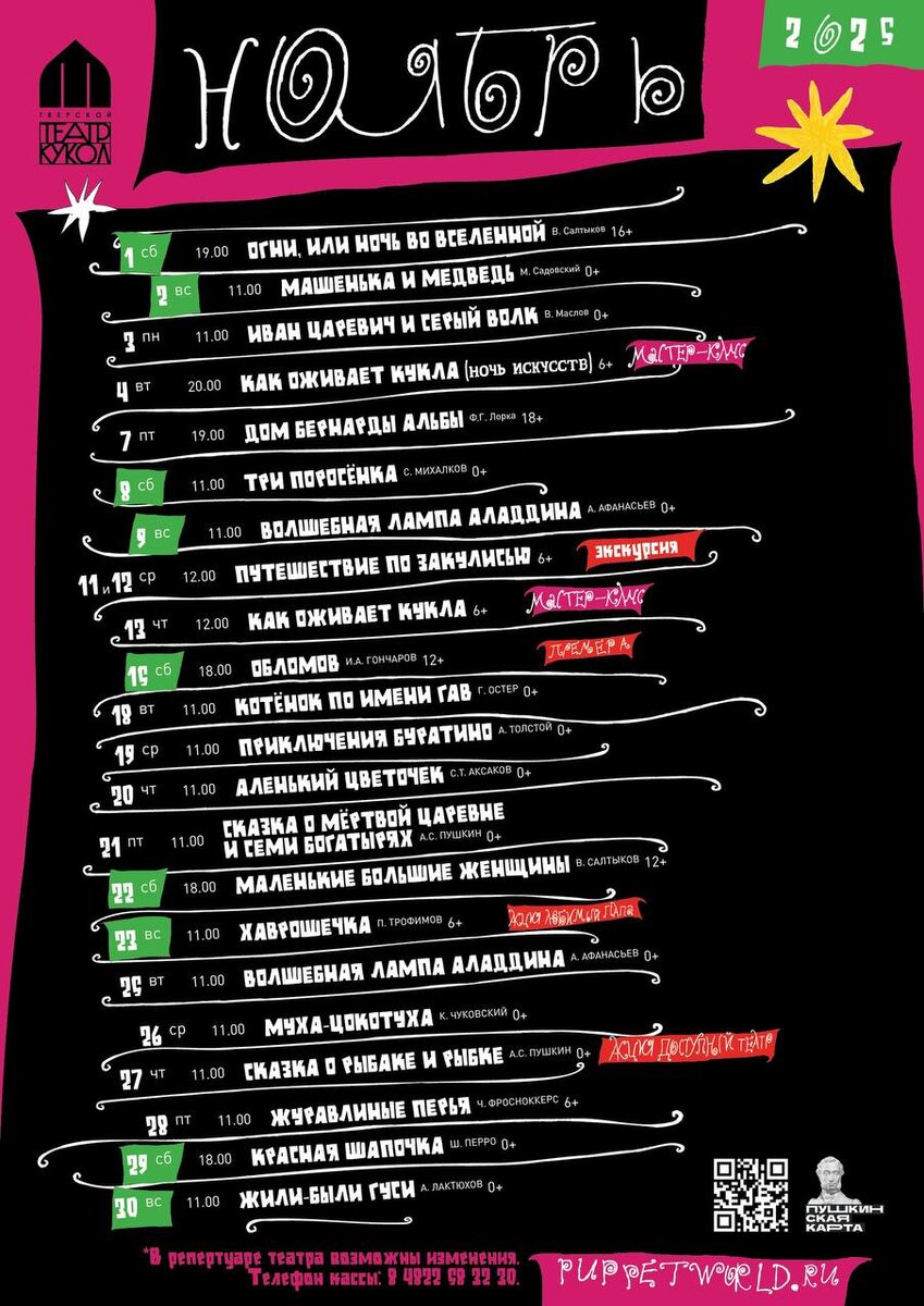 🍂 Октябрь сменился ноябрём. Последний цвет осени опадает жёлтыми листьями. Если Вы также как и мы не можете найти покой и пристанище в серых буднях – приходите к нам! 🌿Разгоните осеннюю хандру и порадуйте свою душу! А чтобы держать себя в тонусе, смотрите расписание НОЯБРЯ. Всё лучшее в нём — уже на сайте ⬇️ https://puppetworld.ru/event-list/ ✈️ Театр кукол в Telegram 💙 Театр кукол ВКонтакте