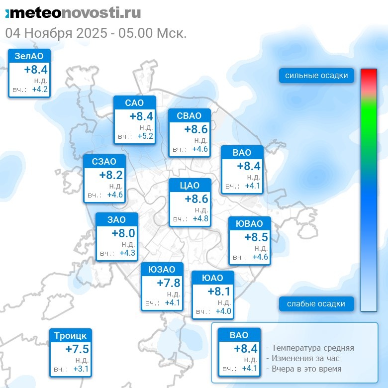 В 5:00 в Москве было от +7.2°C до +8.9°C, средняя температура +8.3°C #погода #Москва #осень #температура #4ноября #вторник Перейти на сайт Прогноз погоды на 14 дней