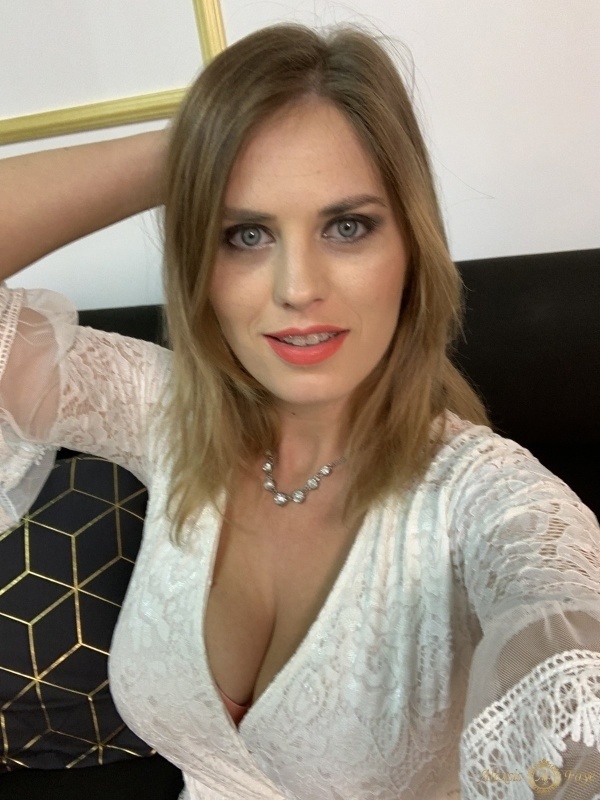 Светлые волосы, аккуратно уложенные, обрамляют лицо, придавая облику свежесть и молодость. Лёгкая улыбка трогает губы, будто женщина хранит в себе маленькую тайну, которую не спешит раскрывать. Взгляд её — тёплый, немного задумчивый, словно она мысленно унеслась в воспоминания или мечтает о чём-то приятном.