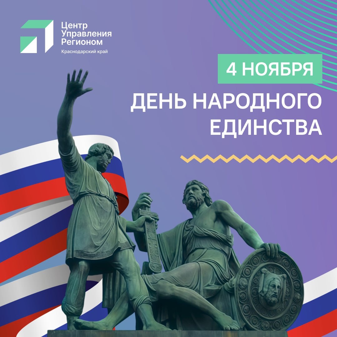 С Днём народного единства! Поздравляем всех жителей Краснодарского края с праздником, который напоминает нам о том, как важно с уважением относиться друг к другу, своим предкам и нашей общей истории. Ведь мы единый народ великой страны, будущее которой зависит от всех нас.