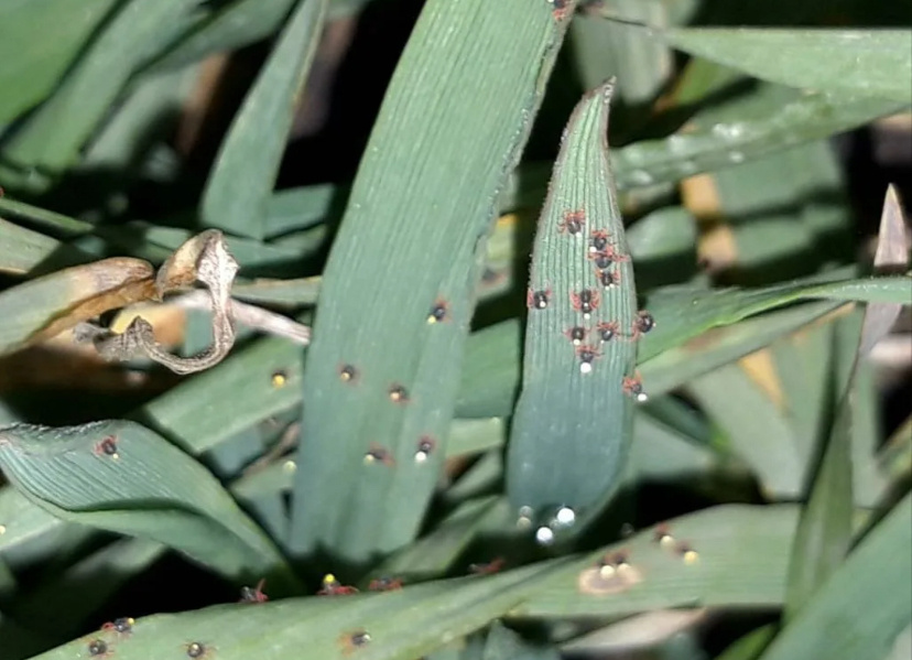 Зимний зерновой клещ (Penthaleus major Dugès) — это серьезный вредитель озимых зерновых культур (пшеницы, ржи, ячменя), а также некоторых многолетних трав и пастбищ. 1. Систематическое положение · Тип: Членистоногие (Arthropoda) · Класс: Паукообразные (Arachnida) · Отряд: Тромбидиформные клещи (Trombidiformes) · Семейство: Penthaleidae · Вид: Зимний зерновой клещ (Penthaleus major) 2. Внешний вид (Морфология) · Размер: Очень мелкий, около 0.8-1 мм в длину, чуть меньше спичечной головки. Увидеть его невооруженным глазом можно, но детали рассмотреть сложно. · Окраска: Тело овальное, темно-зеленого, почти черного или красно-коричневого цвета. Характерная отличительная черта — ярко-красные ноги. · Отличительный признак: На спине, ближе к заднему концу тела, имеется большое оранжево-красное пятно. · Ротовой аппарат: Колюще-сосущий. Клещ прокалывает ткани растений и высасывает сок. 3. Образ жизни и жизненный цикл · Активность: Зимний вредитель. Активен в прохладное и влажное время