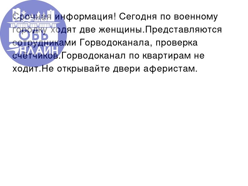 ↗ Срочная информация! Сегодня по военному городку ходят две женщины.Представляются сотрудниками Горводоканала, проверка счётчиков.Горводоканал по квартирам не ходит.Не открывайте двери аферистам. vk.ru Подробнее на https://vk.com/ob.gorod #городобь #городобьонлайн #толмачево