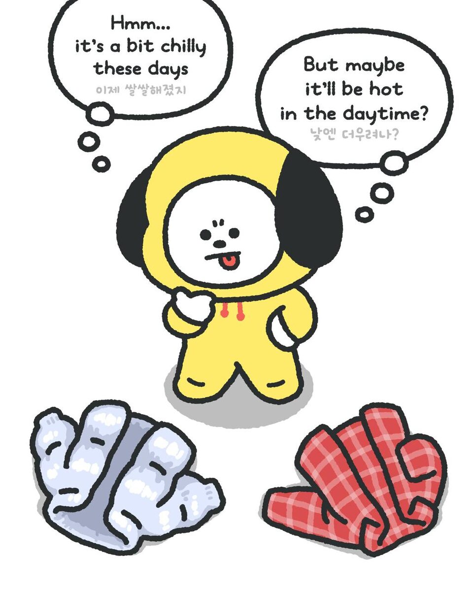 🍊 Обновление X BT21: 💬 Не жарко..? Не холодно..? 💬 Перевод с фото: Чимми: Хм… в последнее время немного прохладно. Но, может быть, днём будет жарко? #BT21 @kumihobts