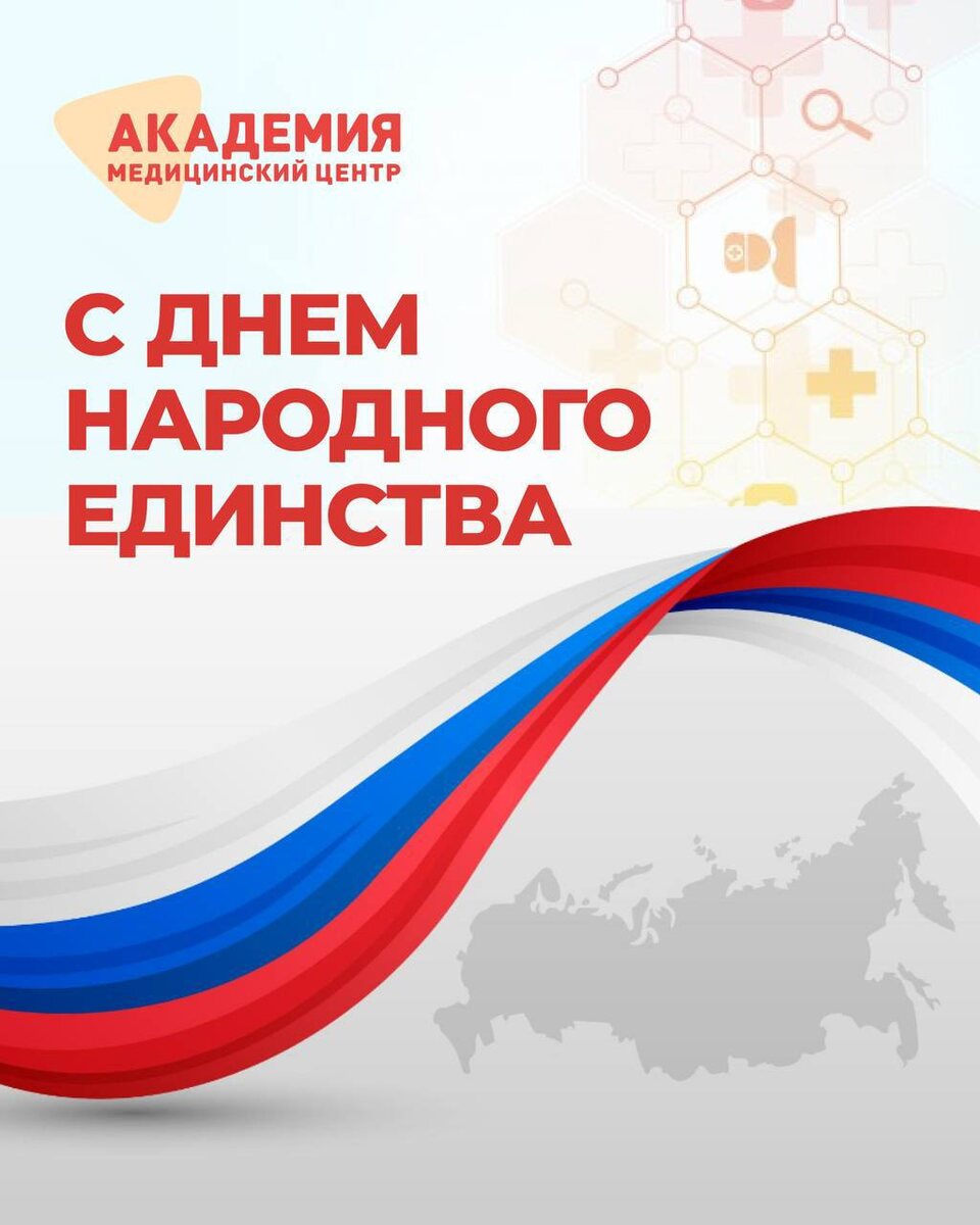 Поздравляем с Днём народного единства!🇷🇺 Этот день напоминает нам, как важны сплочённость, взаимопомощь и уважение друг к другу. Когда мы едины — мы сильнее, вместе можем преодолеть любые трудности, сохранить мир и гармонию, создать счастливое будущее для наших близких. Пусть в каждом доме живут доброта, взаимопонимание и здоровье, а сердца будут наполнены теплом и заботой. Желаем вам крепкого здоровья, душевного равновесия и уверенности в завтрашнем дне. ✨ Берегите себя и своих близких — ведь единство начинается с заботы! С праздником, друзья! С Днём народного единства! 🇷🇺 📍 Медицинский центр «Академия» — телефон 📞 27-05-05 — сайт 🌐 academy-med.ru — телеграм 🌐 @Academychat73