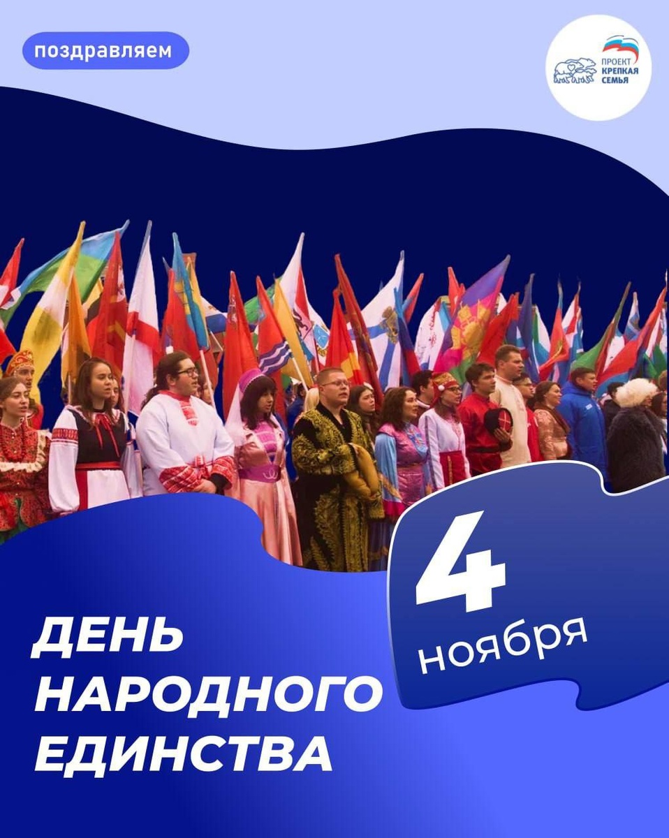 👏 4 ноября — День народного единства! ✅ Сегодня мы отмечаем праздник, который объединяет поколения, народы и регионы нашей великой страны. Культурное многообразие — богатство России, а взаимное уважение — залог её процветания. 🤝 Желаем, чтобы традиции дружбы и согласия между народами крепли с каждым годом. С праздником, друзья! #КрепкаяСемья #ЕдинаяРоссия #ТатьянаБуцкая #ЕР #ПартийныеПроекты #КС