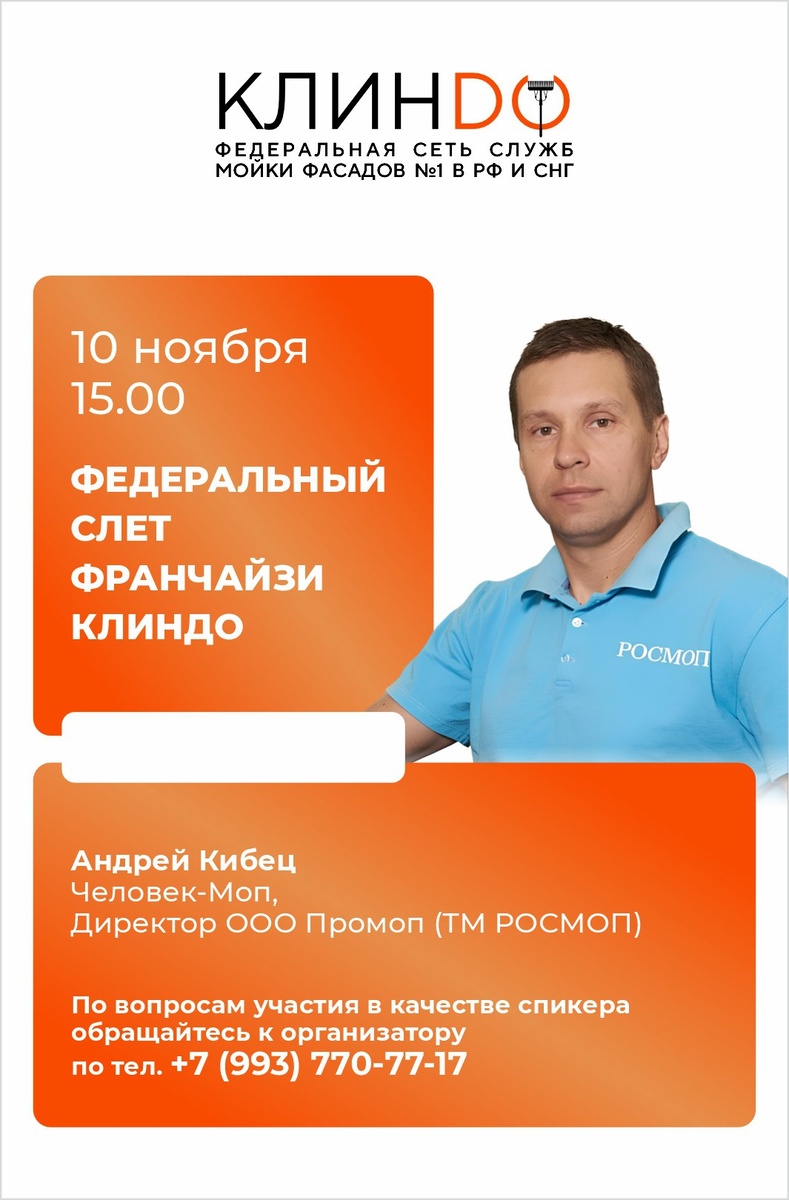 #ЧеловекМоп Коллеги, партнеры, друзья! Второй федеральный слет франчайзи «КЛИНДО» 10 ноября в Москве станет местом, где рождаются эксклюзивные партнерства. Особое внимание заслуживает выступление Андрея Кибеца – основателя ведущей текстильной компании «РОСМОП». Почему участие Андрея – важное событие для вашего бизнеса? Андрей лично представит уникальную продукцию бренда «РОСМОП» – производителя профессионального текстиля, чье качество стало отраслевым стандартом. Его выступление – это не просто демонстрация продукции, а возможность: · Заключить прямые партнерские соглашения с производителем, минуя посредников. · Обсудить специальные условия и эксклюзивные предложения для франчайзи «КЛИНДО». · Получить доступ к инновационным материалам, которые повышают эффективность и скорость работы ваших команд. Это возможность выстроить прямые отношения с ключевым поставщиком отрасли, чтобы снизить операционные затраты и усилить конкурентные преимущества вашего бизнеса. Также в программе слет