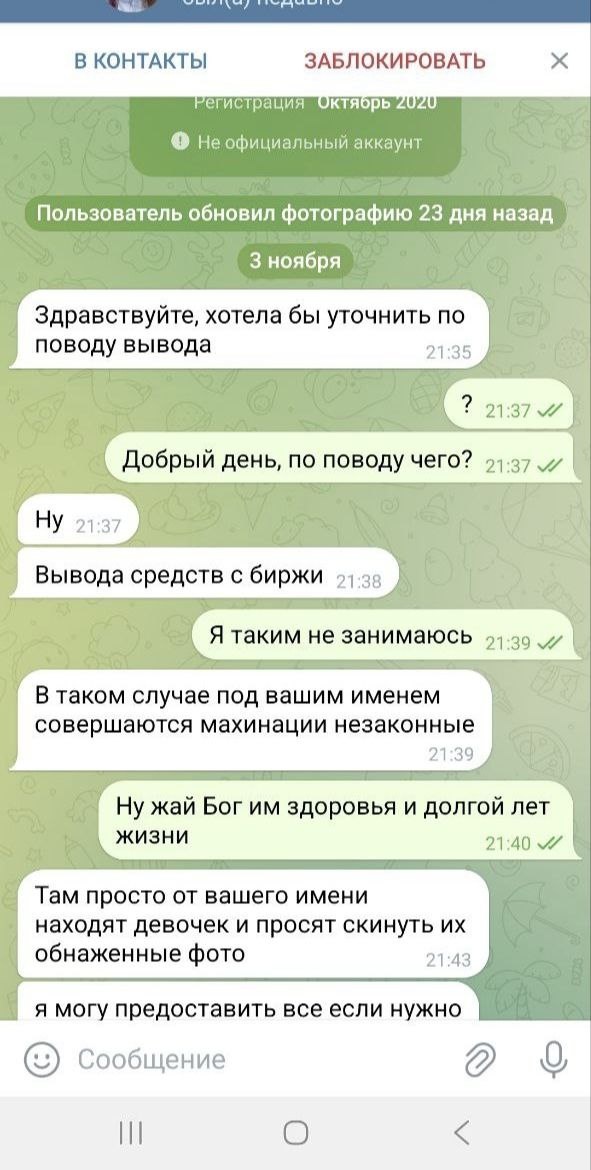 Сейчас будет ШОК-КОНТЕНТ! Недавно получила сообщение от молодой девушки. Она натолкнулась на мошенников, использующих мою фотографию и имя для привлечения жертв. Эти злоумышленники создают фейковые аккаунты, представляясь художницей из Финляндии, и обещают вознаграждение за отправленные интимные фотографии якобы для западного арт-проекта. Однако после получения снимков никакого вознаграждения жертвы не получают. Более того, предлагают внести депозит на биржу криптовалют, чтобы якобы вывести средства за фото. Уважаемые подростки и молодые люди, будьте предельно внимательны и осторожны! Никогда не отправляйте личные фотографии незнакомым людям в сети, а уже тем более не вносите средства на сомнительные криптобиржи. Если вы столкнулись с подобными ситуациями, немедленно сообщайте взрослым, родителям или другим доверенным лицам. Я лично связалась с аккаунтом мошенников и потребовала удалить мои персональные данные. Они быстро отреагировали и выполнили мое требование. Конечно, на аккаунт