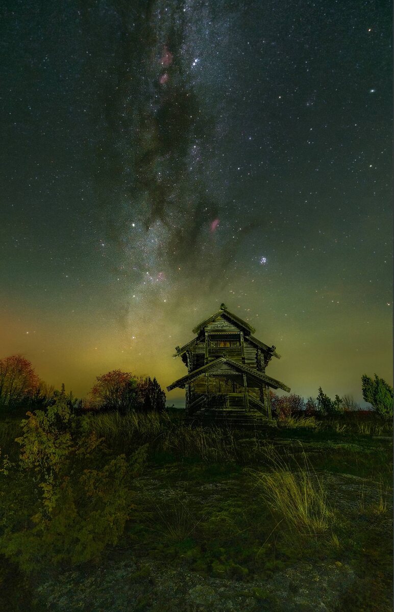 🌌 Млечный Путь в созвездии Возничего над часовней Архангела Михаила У горизонта начинает разгораться полярное сияние. Бортль 3, синяя зона засветки. Небо: стек 50 кадров, 14мм, f/1.8, 8 сек, iso 3200 Низ: стек по фокусу 🗓 16 октября 2025 📍 Заонежье, Карелия 📷 @andrey_snimaet