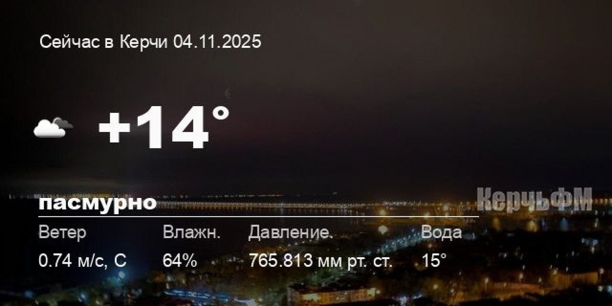 Погода в Керчи 04 ноября Сегодня днем в Керчи, 04 ноября, ожидается пасмурная погода, температура воздуха от +11.5° до +16°С, ветер северный 1.83 м/с, порывы до 5.92 м/с, давление 765.1 мм рт. ст., влажность 62%. Ближайшей ночью ожидается пасмурная погода, температура +14.1°С. Завтра, 05 ноября, в течение суток ожидается пасмурная погода; ночью +14.1°С, днем +13.7°С, ветер 3.23 м/с. - Феодосия от +12.7° до +17°С, ☁️ пасмурно, море: 13°C - Судак от +10° до +14... подробнее Подписывайся на КерчьФМ.РФ @kerchfm