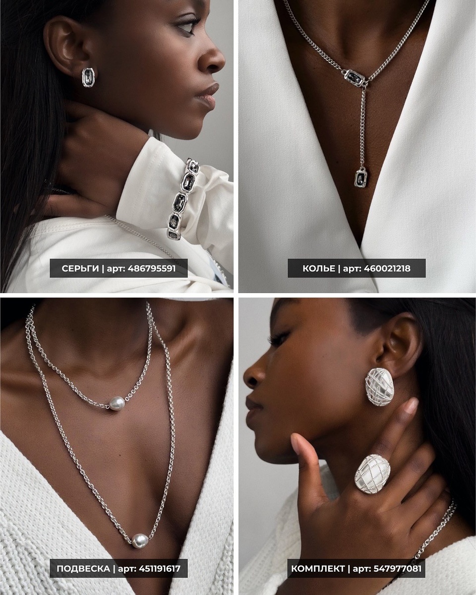 Иногда именно украшение решает всё: простой свитер выглядит дороже, белая рубашка превращается в вечерний наряд, а привычный костюм вдруг начинает играть по-новому. На этих кадрах — серебристая коллекция с Вайлдберриз, в которой продумана каждая деталь: от формы застёжек до длины цепочек.