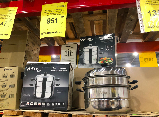 Вот такой насыщенный ассортимент посуды и кухонных принадлежностей представили в магазине «Светофор». Можно подобрать всё — от кружек и стаканов до больших кастрюль и казанов. Цены демократичные, выбор широкий, а качество — вполне достойное.