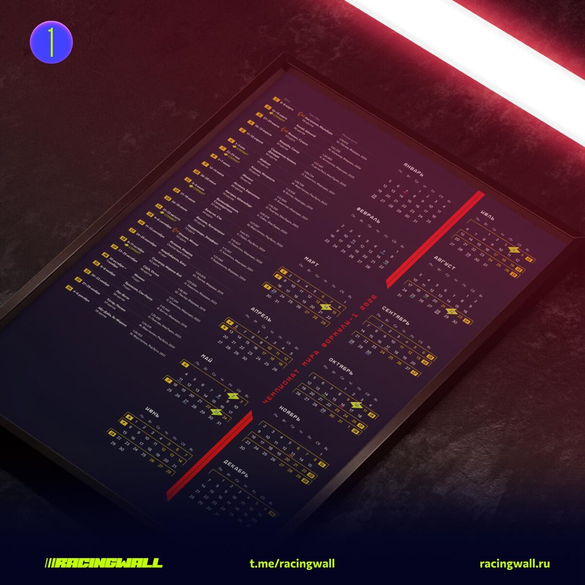 Каркас календаря чемпионата Формулы-1 2026 Как и обещал, сегодня первый каркас календаря. Нужно собрать вместе календарную сетку и расписание Гран-При и посмотреть, как они дружат между собой в двух цветовых схемах. В предыдущих постах я писал о вариантах сетки и расписания и выделял варианты, которые я выбрал для дальнейшей работы. Именно их я сейчас взял для компоновки первого каркаса календаря. Получилось 2 варианта в двух цветовых схемах. Основное отличие в разделителях между полугодиями календарной сетки. И тут у меня снова борьба вариантов — контрастный с названием календаря и историко-информативный с перечислением всех чемпионов кубков конструкторов начиная с 1958 года, именно тогда стали подсчитывать очки не только личного зачета пилотов, но и конструкторов. А в 2026 году оставлено место для вписывания чемпиона собственноручно, на темном календаре это можно будет сделать белым перманентным маркером, на светлой любым контрастным пишущим инструментом. Очень жду в комментария