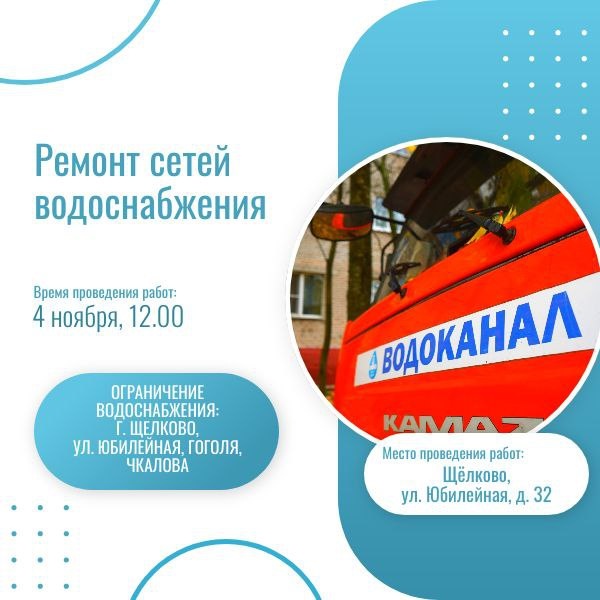 🚧 Ремонт сетей холодного водоснабжения по улице Юбилейная в Щёлково В связи с проведением аварийно-восстановительных работ (Щелково, ул. Юбилейная, д. 32) будет отключено холодное водоснабжение с 12:00 4 ноября до с 17:00 5 ноября по адресам ИЖС: ➡️ ул. Юбилейная, д.1, д.2, д.3, д.4, д.6, д.7, д.8, д.10, д.11, д.12, д.14, д.15, д.16, д.17, д.18, д.20, д.22, д.24, д.26, д.32, д.34; ➡️ ул. Гоголя д.1, 1а, д.2, д.3, д.4, д.5, д.6, д.7, д.8, д.9, д.10, д.11, д.12, д.13, д.14, д.15, д.16, д.17, д.18, д.19, д.20, д.21, д.22, д.23, д.24, д.25, д.26, д.27, д.28, д.29, д.30, д.31, д.32, д.33, д.35, д.36, д.37, д.39, д.41, д.43, д.44, д.48, д.50; ➡️ ул. Чкалова д.6, д.7, д.8, д.9, д.10, д.11, д.12, д.13, д.14, д.15, д.16, д.17, д.19, д.21. 🚚 Адрес подвоза воды: Щелково, ул. Гоголя, д. 30; 4 ноября, 16.00 - 18.00; 5 ноября, 8.00 - 16.30. Приносим извинения за доставленные неудобства. Телефон аварийно-диспетчерской службы водоканала: 84965621172. Подписаться 🔵Вакансии 🔵Личный кабинет ?