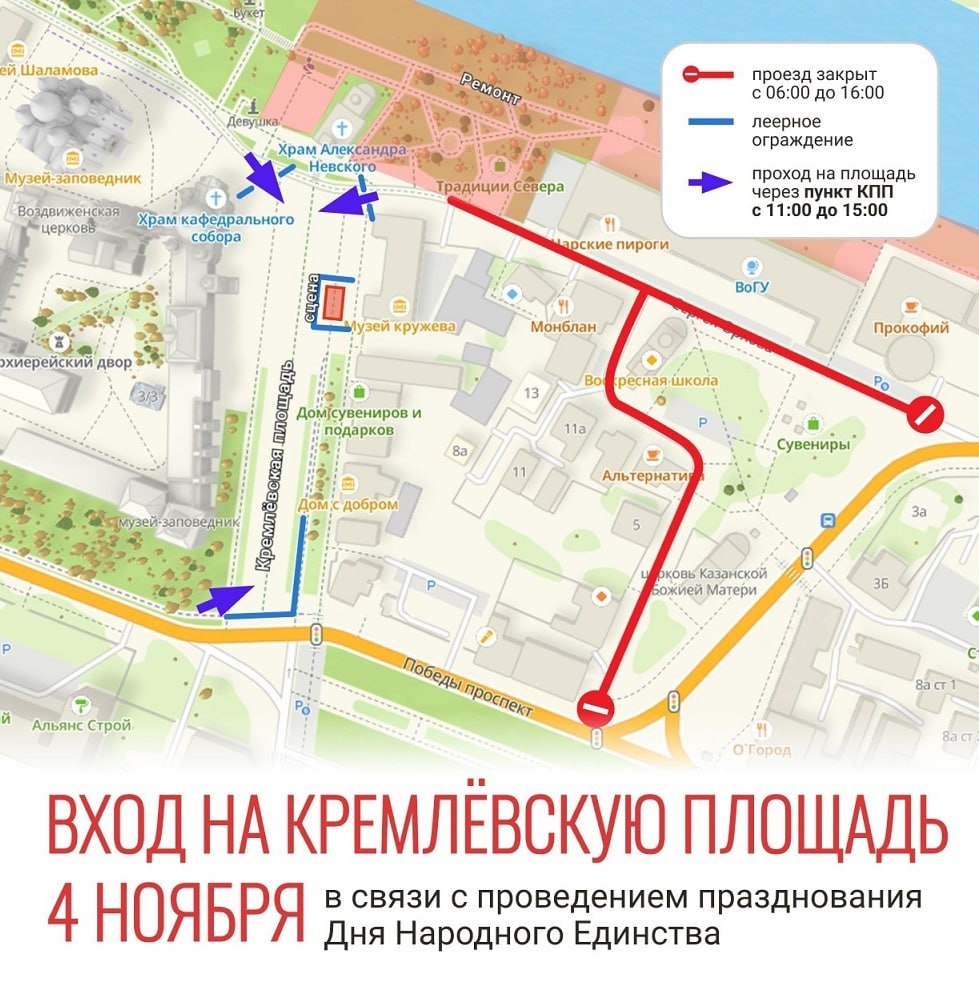 В центре Вологды 4 ноября ограничат движение из-за праздника В День народного единства, движение транспорта в центре Вологды частично перекроют. С 6 утра до 16:00 нельзя будет проехать и парковаться на улице Сергея Орлова — от дома №4 до Кремлёвской площади, а также на Торговой площади — от дома №1 до №17. С 11 до 15 часов попасть на саму площадь можно будет только через КПП у Воскресенского собора, Музея кружева и на перекрёстке проспекта Победы и Батюшкова. Жителям стоит заранее продумать маршрут — особенно тем, кто поедет на праздничные мероприятия. Как вы относитесь к таким перекрытиям — нужная мера или лишнее неудобство? Напишите в комментариях!