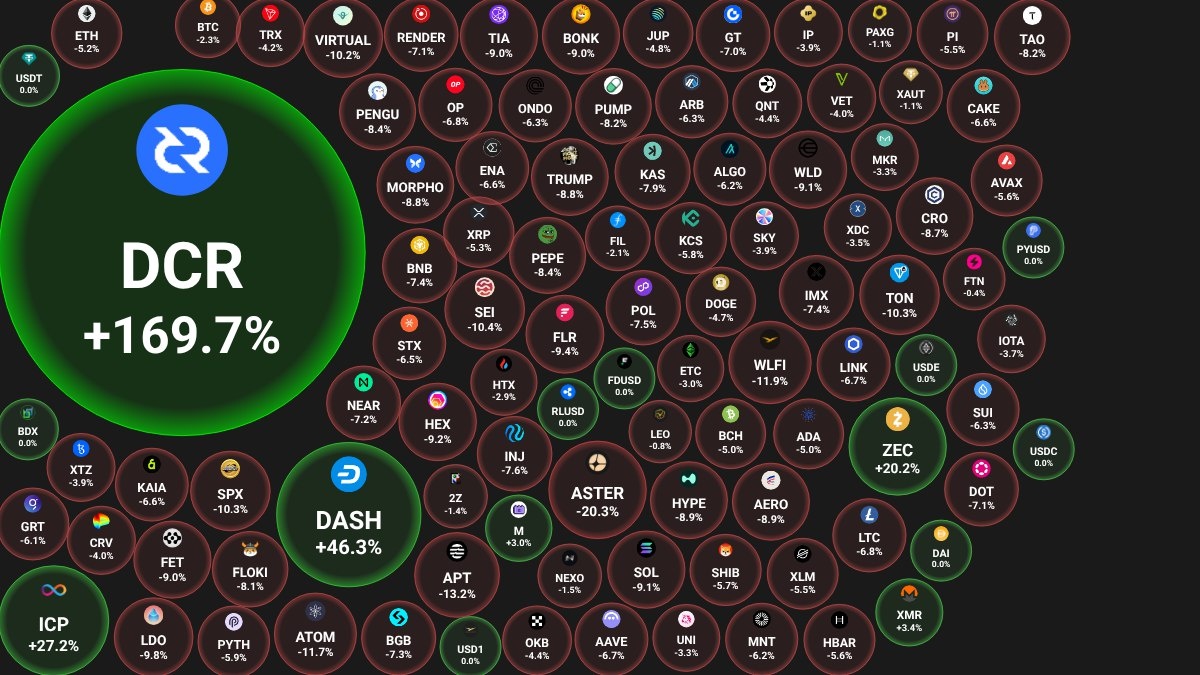 📊 Ежедневный обзор рынка криптовалют от Coinbubbles.ru 🗓 04.11.2025 09:31 по Москве. 🔗 Посмотреть на сайте 📈 Лидеры роста (из ТОП-100): 🟢 Decred (DCR): $51.41 (+169.7%) 🟢 Dash (DASH): $128 (+46.3%) 🟢 Internet Computer (ICP): $4.9070 (+27.2%) 📉 Лидеры падения (из ТОП-100): 🔴 Aster (ASTER): $0.8551 (-20.3%) 🔴 Aptos (APT): $2.7059 (-13.2%) 🔴 World Liberty Financial (WLFI): $0.1112 (-11.9%) 🔍 Основные метрики: 🔴 Общая капитализация: $3480.19 млрд (-3.29%) 🟢 Общий объем торгов: $217.32 млрд (+66.50%) 🟢 Доминация Bitcoin: 60.09% (+0.54%) 🔴 Доминация Ethereum: 12.24% (-0.25%) 🔴 Индекс страха и жадности: 21 / 100: ЭКСТРЕМАЛЬНЫЙ СТРАХ (-21) 🟢 Индекс Альтсезона: 28 / 100: НЕ АЛЬТКОИН-СЕЗОН (+2) 📖 Интересные статьи: 👉 Фьючерсы на криптовалюты в 2025 году: Полное руководство для начинающих. 👉 Что такое Web3: децентрализованный интернет будущего 😻 Наши сервисы и бонусы: 💰 Cryptoage.com - рассказываем про Блокчейн и Криптовалюты с 2013 года 📈 OKX - кешбэк 20% на комиссии
