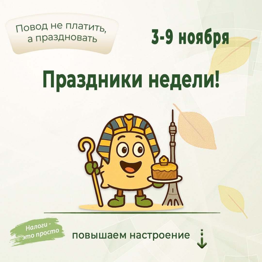 🥳 Каждая неделя дарит интересные поводы, что отметить. То налоги подоспеют, то праздники. Главное, не перепутать, что сдавать, а что отмечать 😄 📅 4 ноября ✅ День народного единства. Когда вместе, то справиться с налогами, вычетами, сделками проще. И даже заполнить декларацию и написать жалобу на отказ инспектора становится не страшно. ✅ Годовщина открытия гробницы Тутанхамона. Археологи нашли золото спустя тысячелетия. Так и вы — храните документы, как сокровища. Пусть через века ваши потомки найдут договор купли-продажи и гордо скажут: «Вот где началась наша финансовая династия!» 📅 5 ноября ✅ День рождения Останкинской башни. Стоит ровно, смотрит свысока и никуда не торопится. Вот бы всем нам такую уверенность, особенно перед сдачей отчётности. 📅 6 ноября ✅ Всемирный день без бумаги. Прекрасный повод напомнить: отчётность давно подаётся онлайн. Бумага - только для договоров и справок. А всё остальное решается в пару кликов в личном кабинете. Бережём лес и нервы! 🌲💻 📅 7