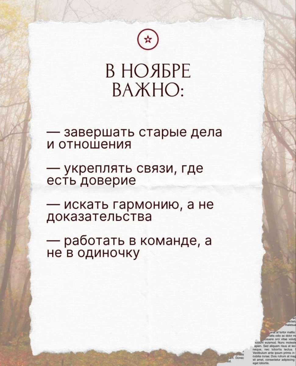 ❎Ноябрь — время осознанности и завершения дел🍁🍂🍂🍁🍁🍁🍁🍁🍁🍁🍁 Этот месяц мягко подводит нас к итогам. То, что начиналось весной, сейчас просит либо завершения, либо переосмысления 🍁Энергия ноября — под числом 2️⃣ 🌞Она про партнёрство, сотрудничество, тонкое ощущение баланса. Сейчас важно не спешить, а слышать — себя и других ❇️В ноябре хорошо: — завершать старые дела и отношения — укреплять связи, где есть доверие — искать гармонию, а не доказательства — работать в команде, а не в одиночку 🔀 Если идти против энергии месяца — появятся недопонимания и внутреннее напряжение Если следовать — всё выстроится само, шаг за шагом 🚺 Ноябрь учит не спешить. Он напоминает: когда внутри тишина, ответы🍁 приходят сами🍁🍁🍁