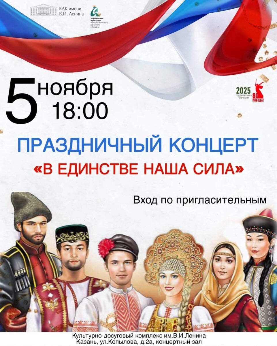 Концерт «В единстве наша сила»» 🗓️ 5 ноября ⏰ 18:00 💸 бесплатно 🏫 ДК им. Ленина 📍 ул. Копылова, 2а, 4 этаж, малый зал 🎉В программе концерта выступление лучших творческих коллективов ✅Вход по пригласительным, которые можно бесплатно получить на вахте учреждения. ➡️ ПОДРОБНОСТИ ⬅️ ❗️ Детская Афиша | Казань Больше информации в нашей группе, переходите