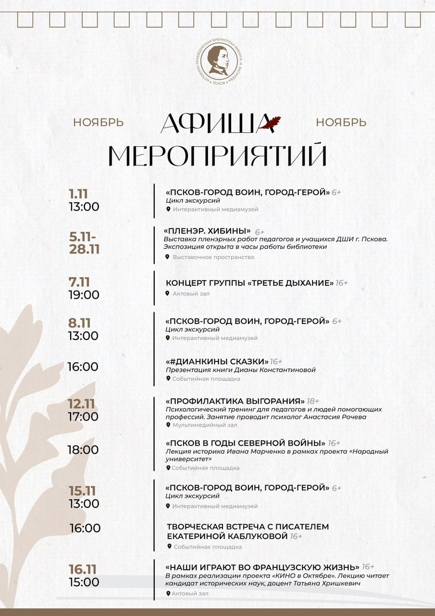 В Библиотеке им. И.И. Василёва в Пскове в ноябре пройдет множество интересных событий 📜