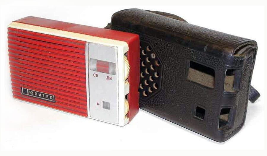 Портативные радиоприёмники «Юпитер» и «Юпитер-М». С 1964 по 1967 годы Днепропетровский радиозавод производил радиоприёмник *Юпитер*, который представлял собой супергетеродин, собранный на семи транзисторах. Этот приёмник был предназначен для приёма в диапазонах длинных и средних волн. Чувствительность приёмника в диапазоне ДВ составляла 1,5 мВ/м, а в диапазоне СВ — 0,8 мВ/м. Селективность устройства достигала 26 дБ, а номинальная выходная мощность — 60 мВт. Диапазон воспроизводимых частот охватывал диапазон от 450 до 3000 Гц. Корпус приёмника, изготовленный из полистирола, состоял из двух частей, включая отсек с крышкой для источника питания. Для удобства переноски в комплект входил кожаный футляр. Устройство имело гнездо для телефона ТМ-4, при подключении которого громкоговоритель автоматически отключался. Приёмник продолжал функционировать даже при снижении напряжения питания до 5,6 В. Ручки настройки и громкости, а также гнёзда для наружной антенны и телефона располагались на ле
