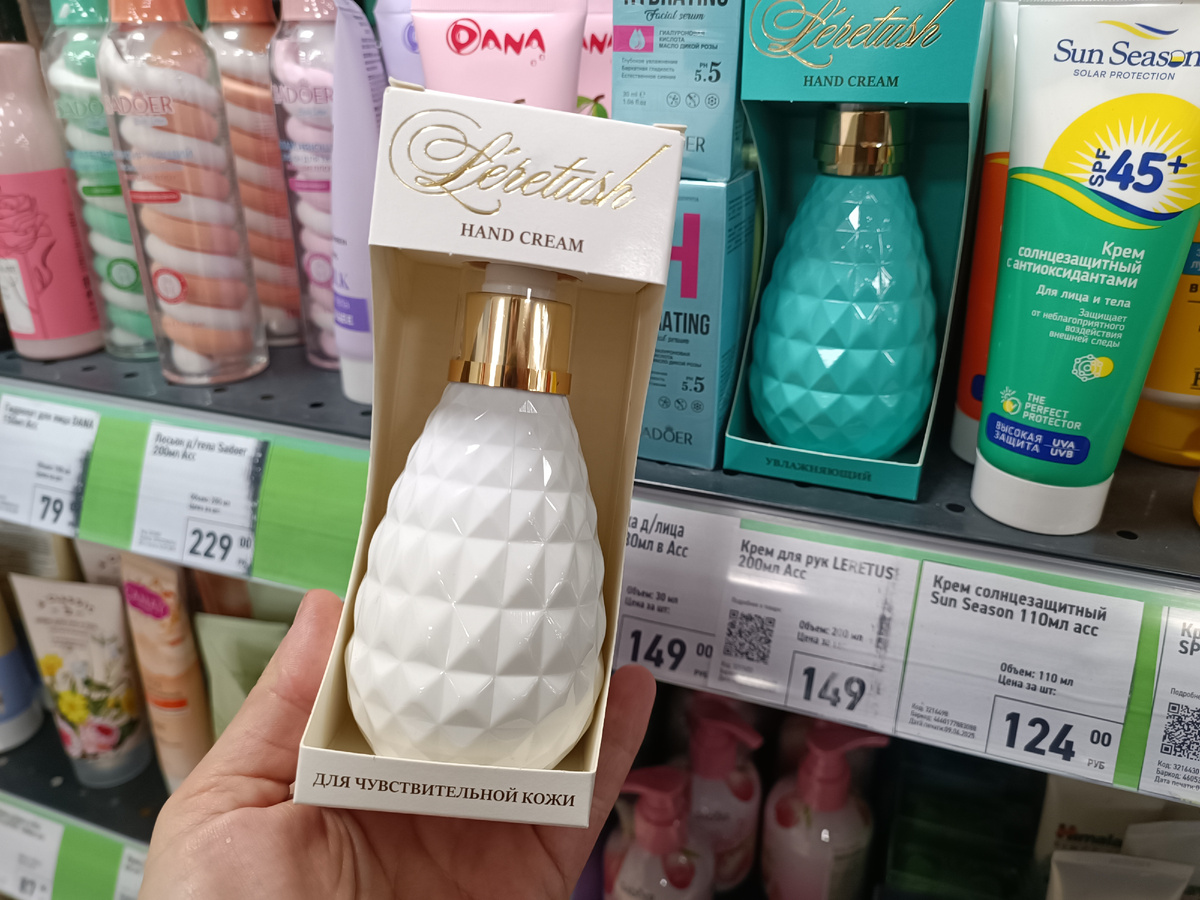 Давненько я не заходила в «Фикс Прайс»: была вся в дачных хлопотах. Да и казалось бы, что там может появиться интересного после новогодних товаров, которые мы все уже рассмотрели и частично купили🤭 Может! Опять появились интересные новинки, мимо которых сложно пройти. Например, вот этот крем для рук станет удачным дополнением к новогоднему подарку. Мне очень нравится серия от Leretush, продающаяся в ФП всего за 149 рублей. Представлен в трех вариантах, я сейчас предпочитаю тот, что для чувствительной кожи. У него нежный аромат, тающая текстура, а ручки после него становятся как шелковые. Что для меня немаловажно — очень стильная упаковка. Такой флакончик, похожий на фарфоровый, эстетично смотрится на полочке, его даже в руках держать приятно. И кремы с дозаторами мне кажутся более удобными, чем традиционные тубы или баночки. Себе и на подарки беру еще парфюмированное жидкое мыло от Leretush. Ароматы можно подобрать на свой вкус, а смотрится такой флакон, опять же, дорого и стильно. О